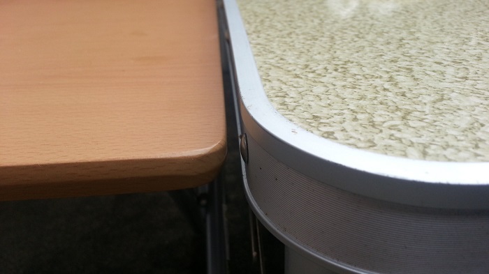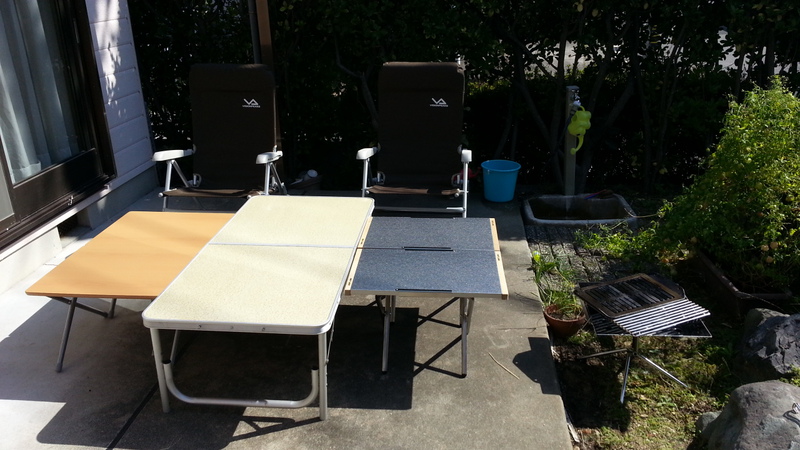 焚き火テーブルとその左横のテーブルの高さは37cm、お値段以上ニ〇リのテーブルは35cm