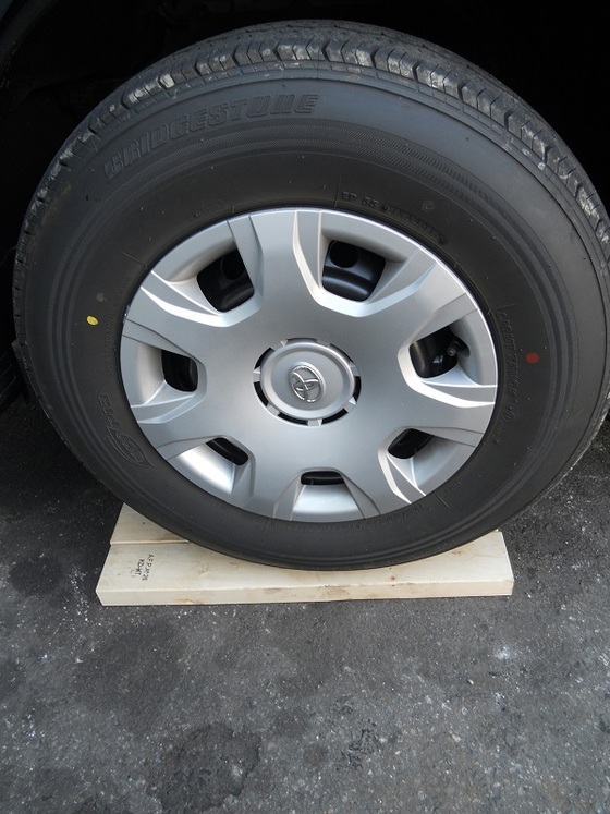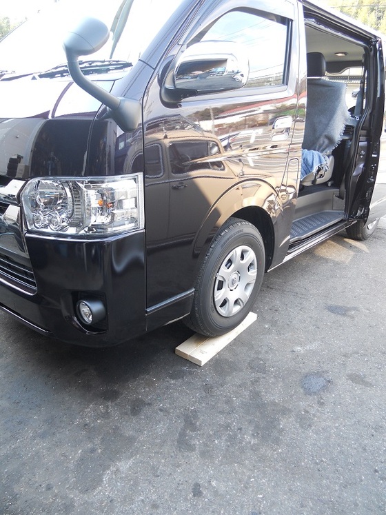 ジャッキアップをしなくても得意の2×4の木材を右フロントに置いて乗り上げれば車両の下にもぐれます。